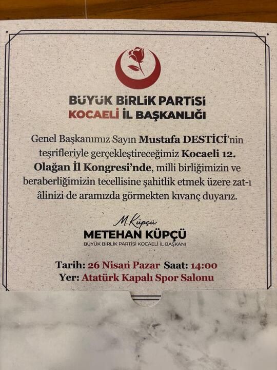 Büyük Birlik Partisi Kocaeli İl Kongresi 26 Nisan’da İzmit’te yapılacak; mevcut İl Başkanı Metehan Küpçü tek aday olarak seçime girerken, Genel Başkan Mustafa Destici de programa katılarak teşkilatla bir araya gelecek.