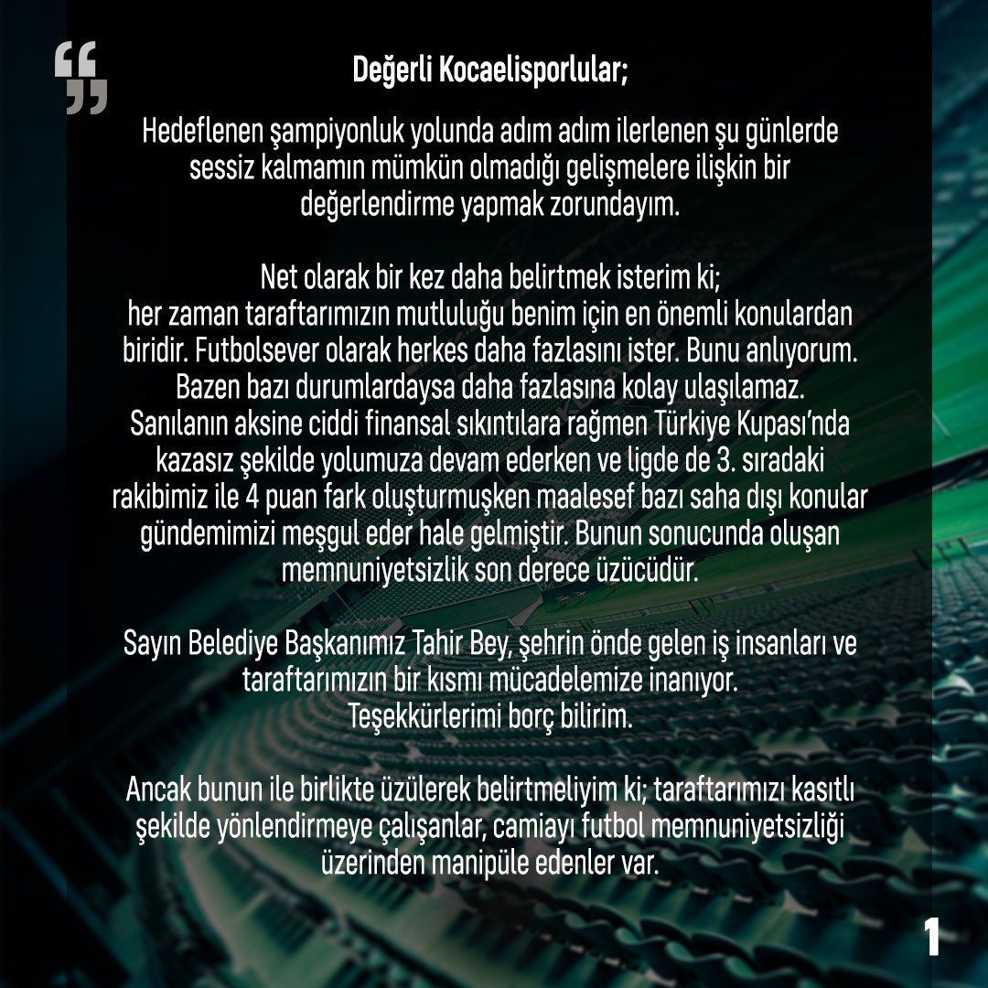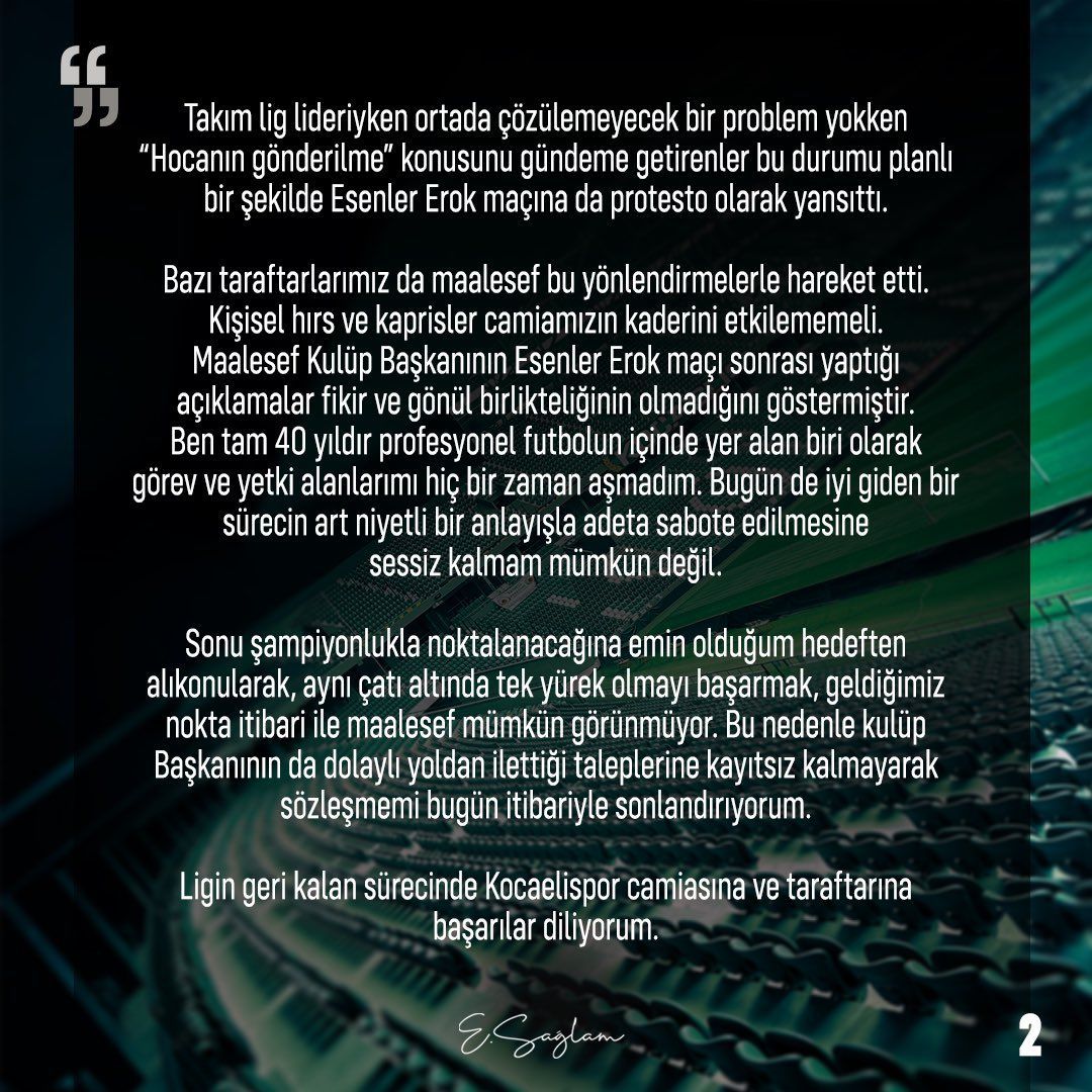 Maalesef Kulüp Başkanının Esenler Erok maçı sonrası yaptığı açıklamalar fikir ve gönül birlikteliğinin olmadığını göstermiştir. Ben tam 40 yıldır profesyonel futbolun içinde yer alan biri olarak görev ve yetki alanlarımı hiç bir zaman aşmadım. Bugün de iyi giden bir sürecin art niyetli bir anlayışla adeta sabote edilmesine sessiz kalmam mümkün değil. Sonu şampiyonlukla noktalanacağına emin olduğum hedeften alıkonularak, aynı çatı altında tek yürek olmayı başarmak, geldiğimiz nokta itibari ile maalesef mümkün görünmüyor. Bu nedenle kulüp Başkanının da dolaylı yoldan ilettiği taleplerine kayıtsız kalmayarak sözleşmemi bugün itibariyle sonlandırıyorum. Ligin geri kalan sürecinde Kocaelispor camiasına ve taraftarına başarılar diliyorum”